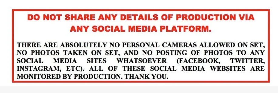 ***NO PERSONAL PHOTOGRAPHY or VIDEO of any kind is allowed on set. Including "Selfies", pictures of locations, sets, base camps, etc. Also, please DO NOT POST anything in connection with the series to any websites, forums or other social media. Cell phones should be put away while on set. This is a professional environment.**